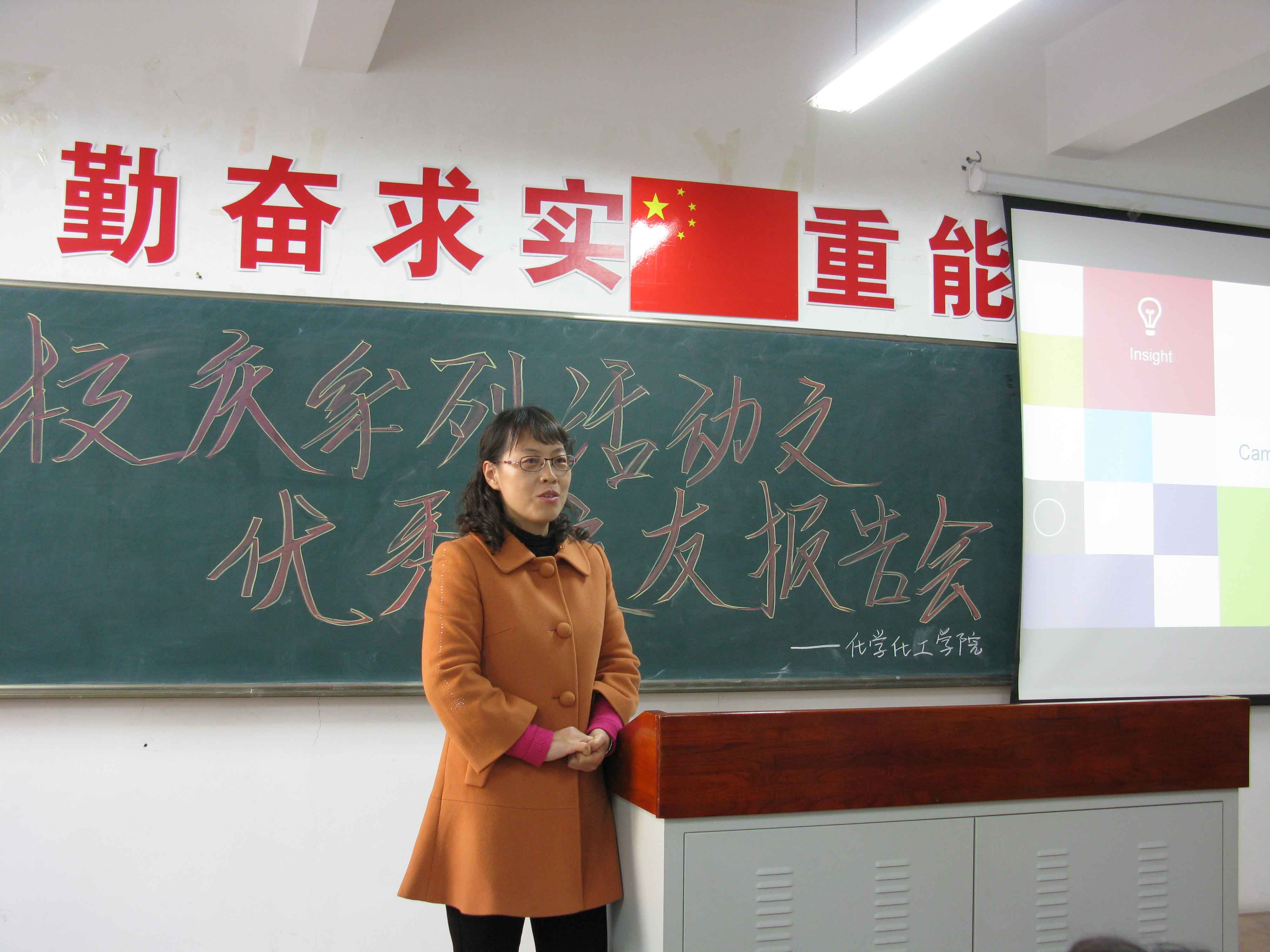 校庆系列活动之优秀校友报告会在理化楼C区411举行,出席本次报告会的嘉宾有我院2002级化学专业毕业生施阳和辉瑞制药公司的吕宜男、吕正军。化学化工副院长杨梅老师,党总支副书记李群老师,王秋老师,金晶老师,吕成伟老师出席了本次报告会。2013、2014级本科生和部分研究生参加了本次报告会。