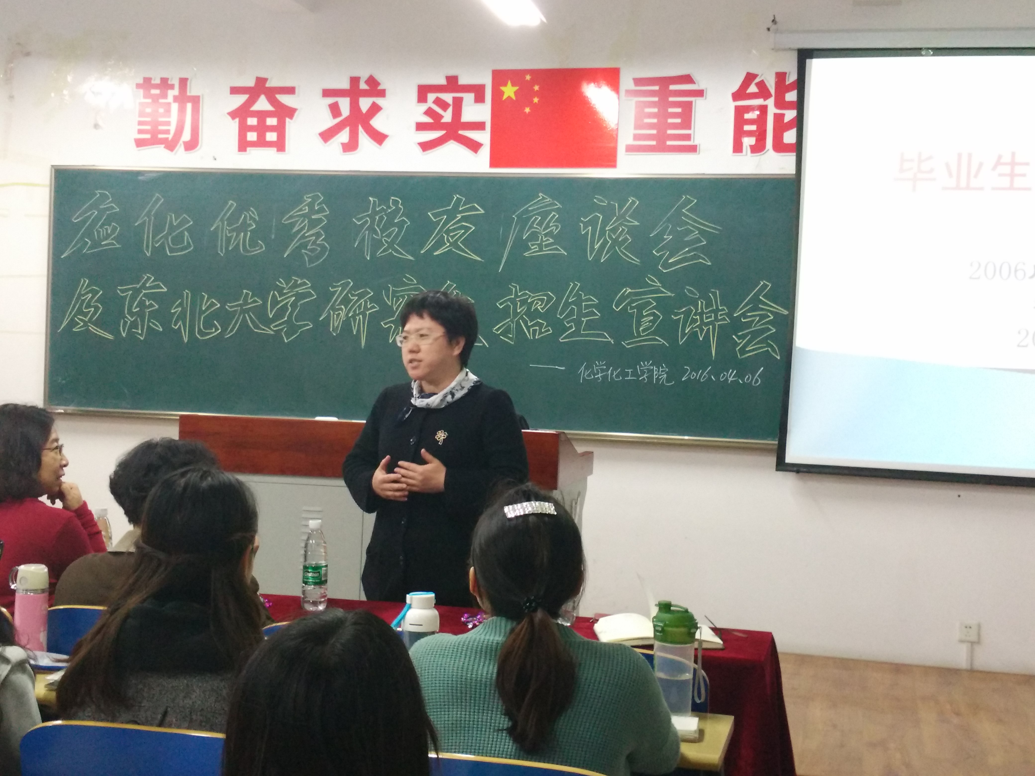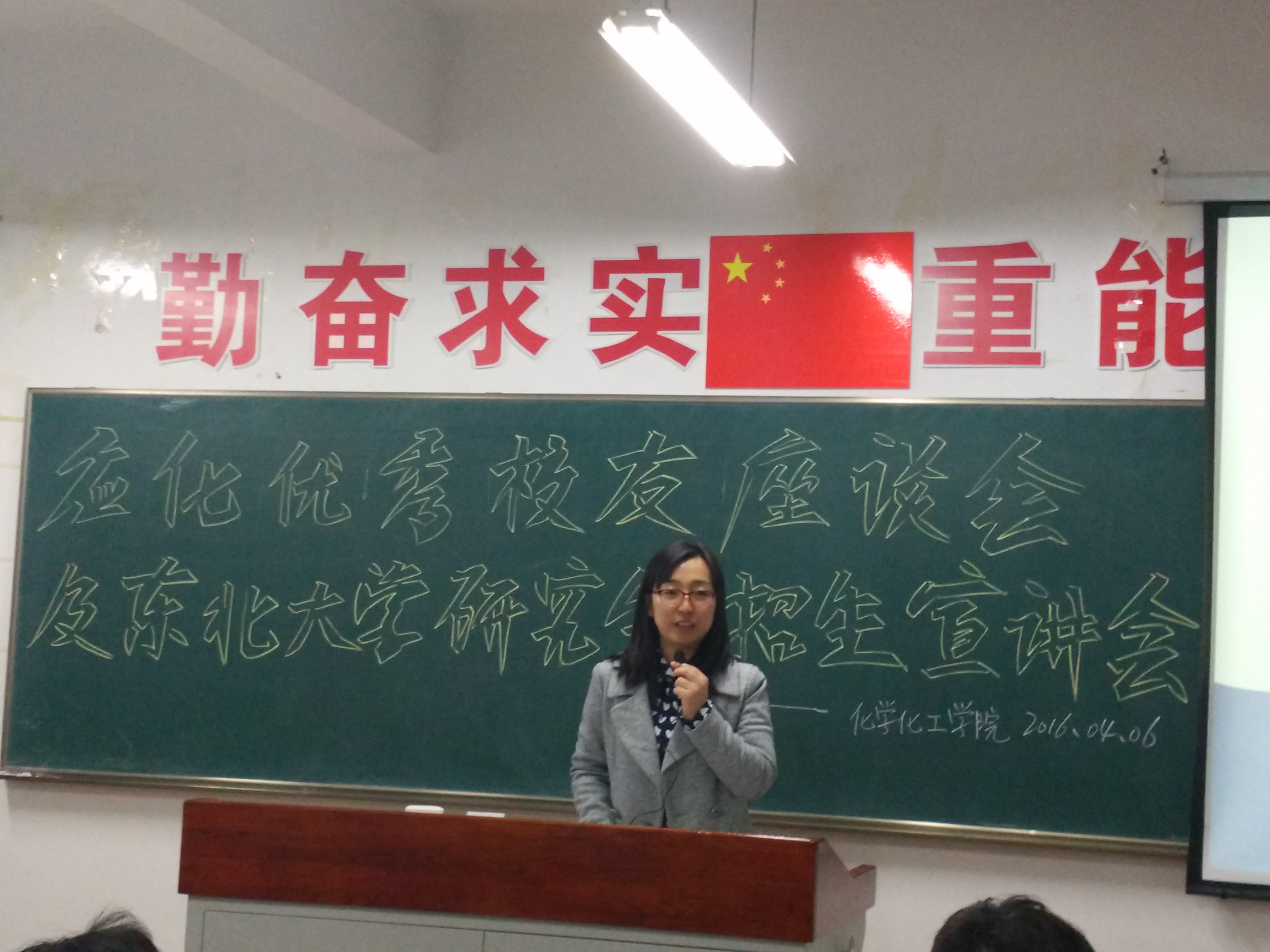 杨春光校友与同学们分享了自己的求学经历及工作经验。她指出,辽师应用化学专业的理论课程、实验课程和实践课程设计非常好,加上老师们认真负责的教学态度,帮助她奠定了扎实的理论基础和实验技能;多样的课外活动增强了她的团队意识和拼搏精神,这些都为她日后的发展奠定了良好的基础和提供强大的助力。同时她还就考研的心态、方法等与同学们分享,并介绍了东北大学招收研究生的详细情况。杨春光校友坦诚的态度、质朴的语言、幽默风趣的例子,使同学们受益匪浅。大家深受鼓舞,踊跃就感兴趣的问题和自己的困惑与校友进行交流,场面亲切而热烈。本次座谈会使13级同学在升学还是就业选择上深受启发,1415级同学也明确了在校期间的努力方向。