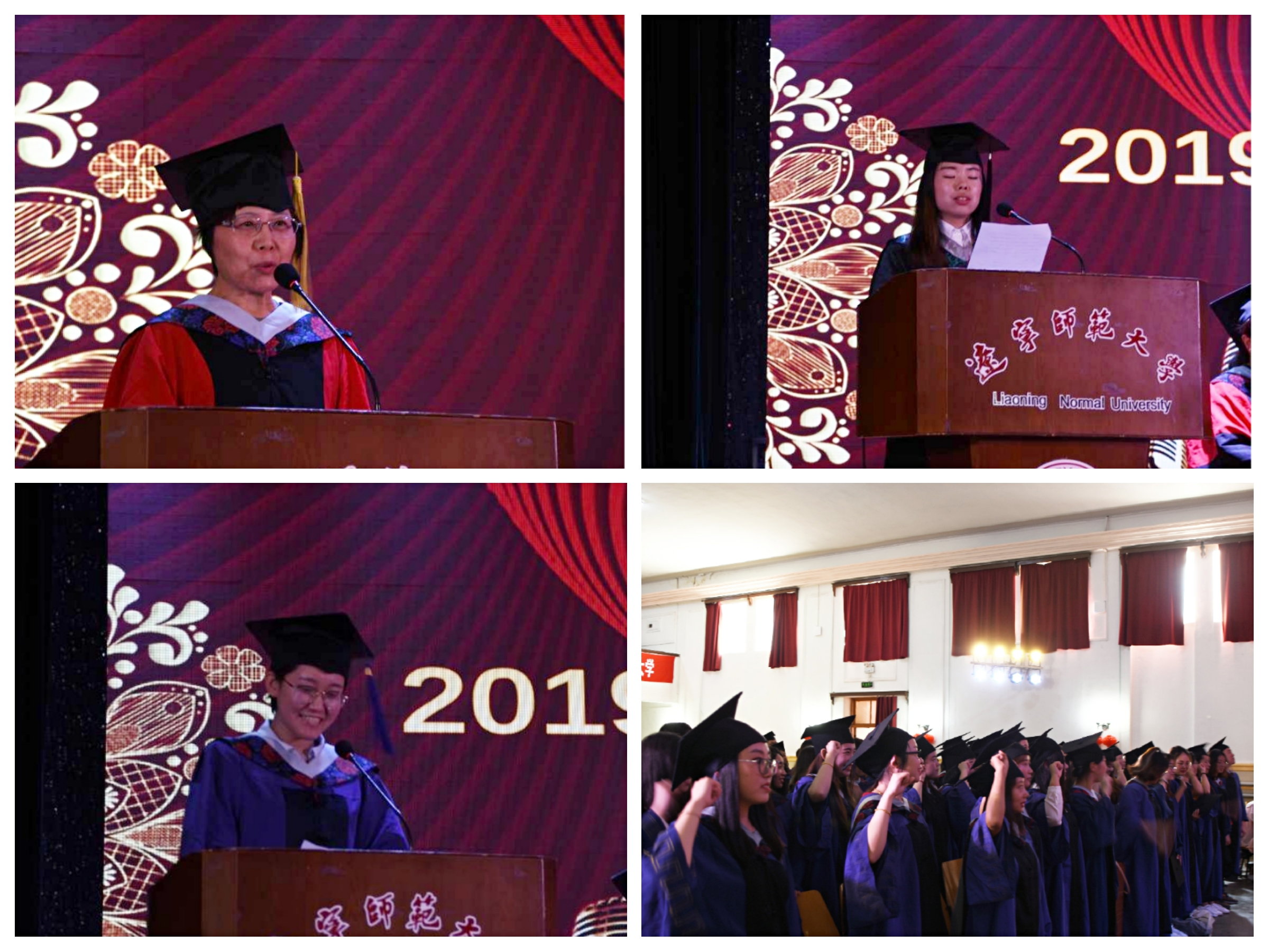 接着,2019届本科毕业生代表董佳和研究生毕业生代表赵梦元分别用生动朴实的话语回忆了在校期间五彩缤纷的往事,表达了对老师们的衷心感谢、对母校深深的留恋,并为2019届全体毕业生送上美好的祝福。教师代表赫春香老师发表讲话,她将自己的座右铭分享给同学们:“让认真成为能力,让优秀成为习惯,做最好的自己。”希望同学们能够发扬化院精神,遇见更好的自己。李月鑫带领2019届全体毕业生宣誓,立下了铮铮誓言:“弘扬师大精神,珍惜学校荣誉;牢记历史使命,肩负社会责任;诚实做人,踏实做事;为国为民,建功立业!”