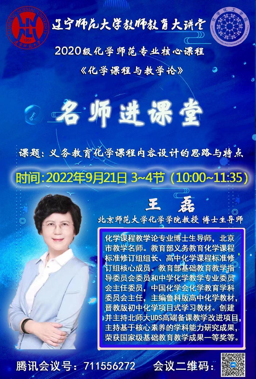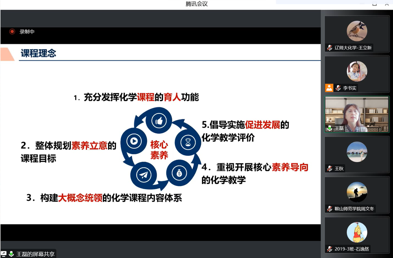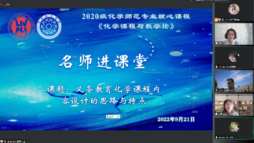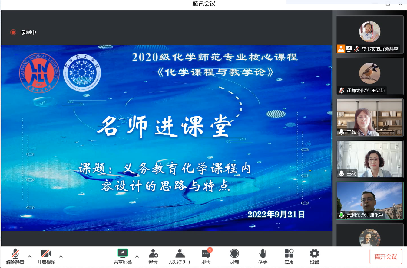 为充分发挥名师引领示范作用,促进本科课堂教学改革,我院于9月21日上午通过腾讯会议成功举办“名师进课堂”活动。本次活动特邀教育部义务教育化学课程标准修订组组长、北京师范大学化学学院博士生导师王磊教授莅临我院化学(师范)专业核心课程《化学课程与教学论》的线上课堂,为2020级化学(师范)专业本科生以“义务教育化学课程内容设计的思路与特点”为题进行教学。