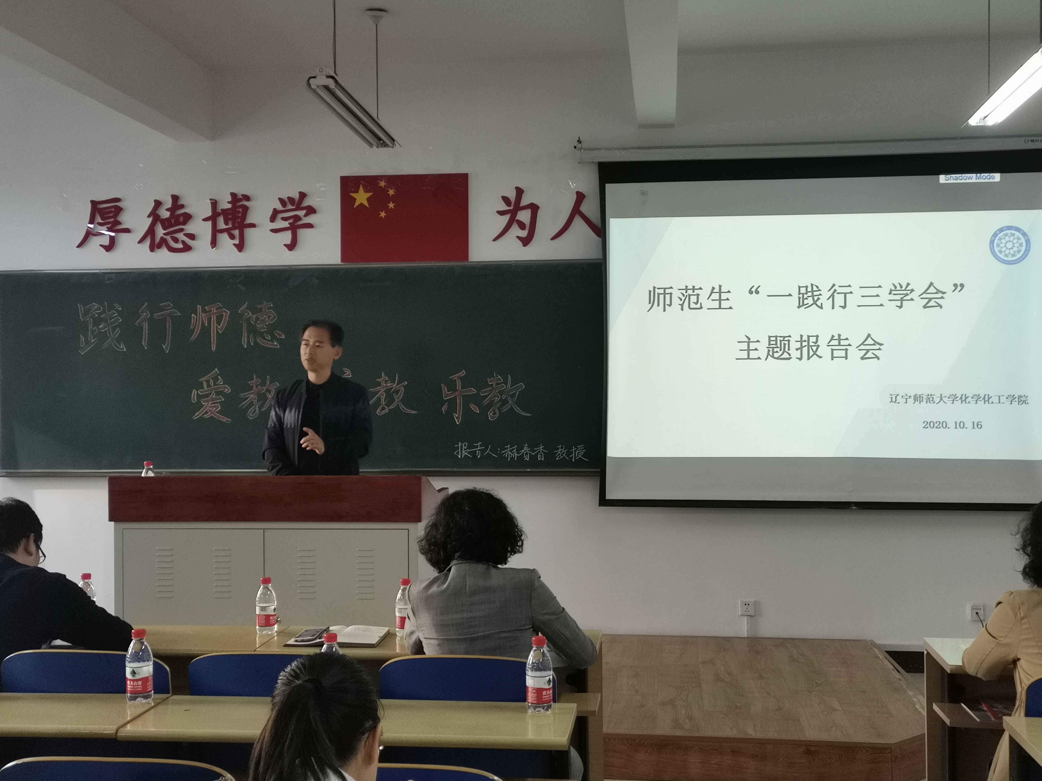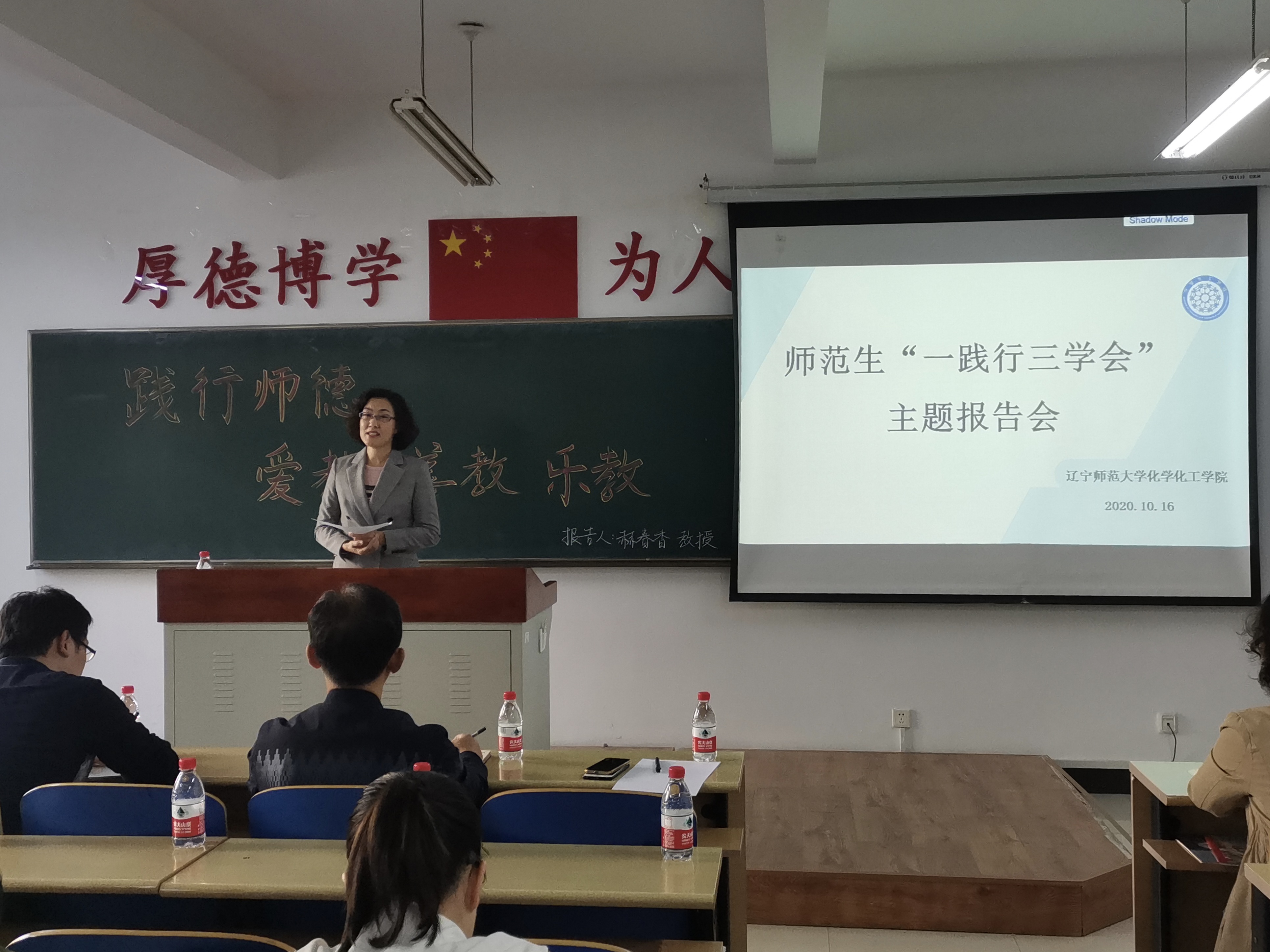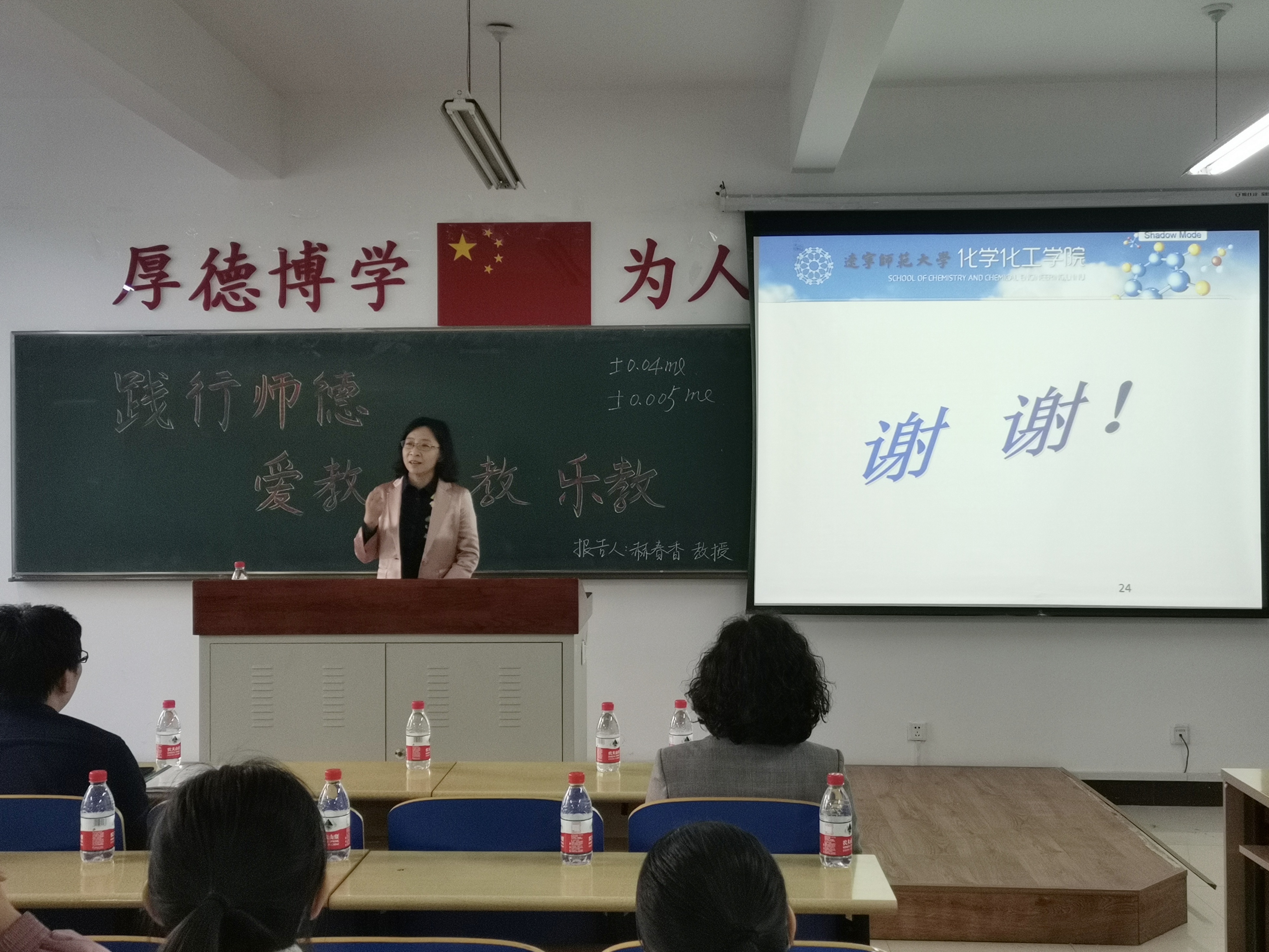 赫春香教授。出席本次报告的领导及嘉宾有学院党委书记刘智广、教学院长金晶、化学(师范)专业负责人杨梅、化学教育研究所所长王秋、功能材料化学研究所单文娟、化学教育研究所黄翠英、李书实、王立新及正在进行教育实习的2017级全体师范生。本次报告由学院化学教育研究所所长王秋主持。