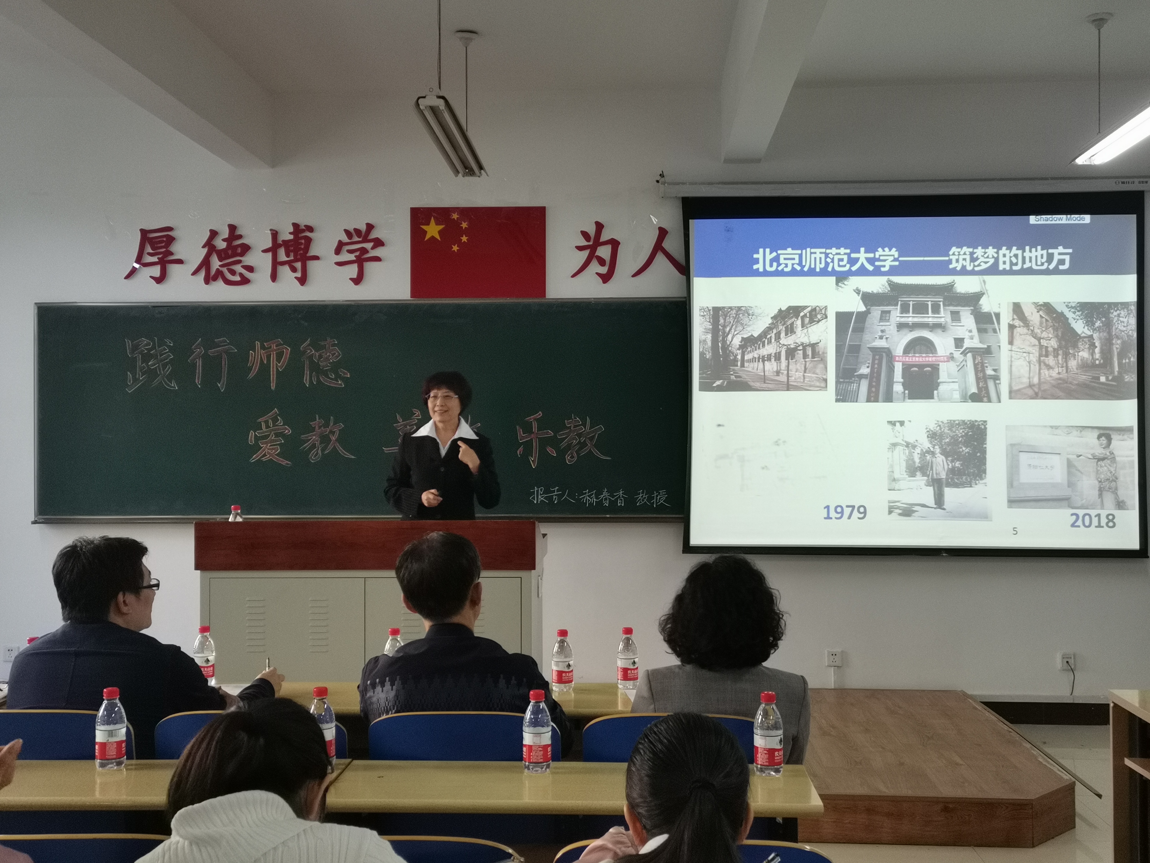 接下来,赫春香教授从自己母校——北京师范大学讲起,回忆从教历程。赫老师认为,教师不单建立学生的知识体系,更塑造学生的思想体系,教师将影响学生的一生,教师的一切言行都要起到模范带头作用。赫春香教授讲到,由于凯库勒日日夜夜研究,才能梦到苯的环结构,其自身也有类似的经历,由于对教育事业的用心与热爱,才能够梦到滴定管的改进方法,不但节省了试液,而且对环境保护做出了贡献。爱是做一件事情的原动力,能激发出人未知的潜能,也正是这份热爱,才使得39年教师生涯一直富有热情。