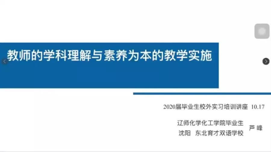 为提升师范生教学能力,培养具有先进教学理念、扎实教学技能的优秀教师后备力量,我院于10月17日晚借助腾讯会议平台开展师范生“一践行三学会”主题系列报告会第二讲。本次报告的题目为“教师的学科理解与素养为本的教学实施”,主讲人为东北育才双语学校教师芦峰。出席本次报告的领导及嘉宾有学院教学院长金晶、化学(师范)专业负责人杨梅、化学教育研究所所长王秋、功能材料化学研究所单文娟、无机化学研究所朱江、物理化学研究所杨永彪、化学教育研究所黄翠英、李书实、王立新及2017级、2018级本科师范生及学科教学(化学)专业研究生。本次报告会由学院化学教育研究所所长王秋主持。