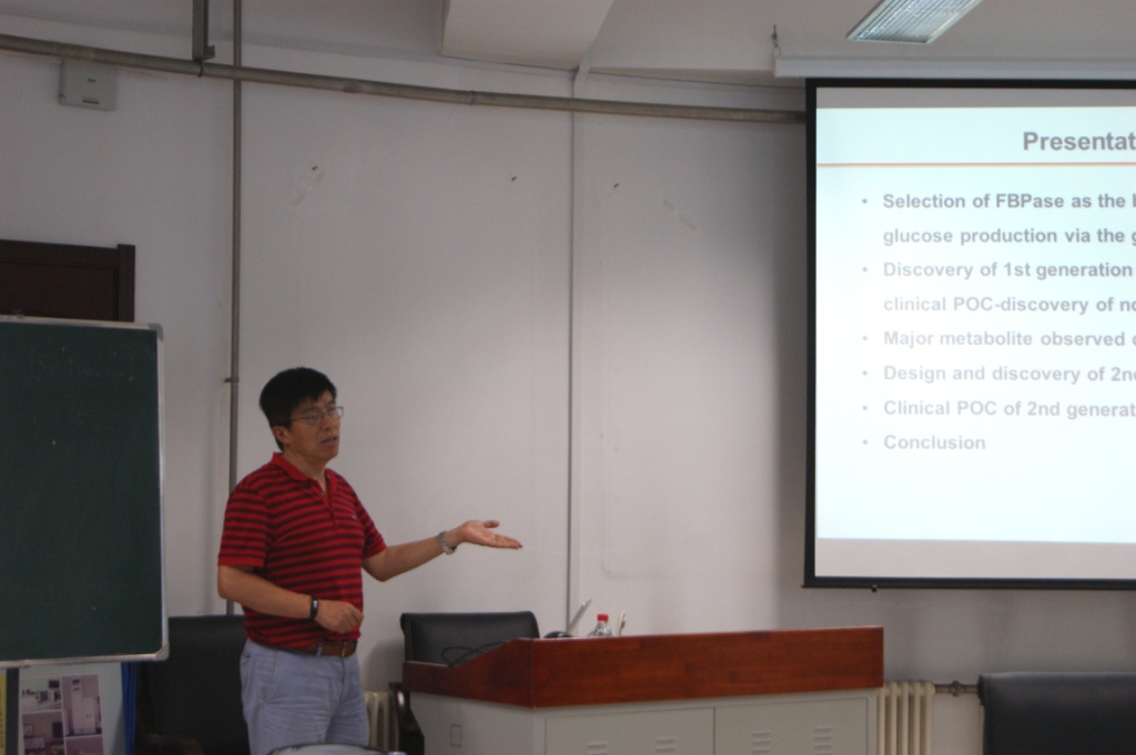 党群博士的报告围绕新型1,6-二磷酸果糖抑制剂(FBPase)的研发历程,详细阐述了基于靶点结构药物的研发策略,设计和开发两代FBPase抑制剂,这一方法通过直接和特异性抑制过多生成通路―主要是糖原异生通路,来减少肝生成葡萄糖的数量。该化合物已经进入Ⅰ期和Ⅱ期临床试验, 将在2型糖尿病的治疗中发挥重要作用。党群博士的报告精彩纷呈、生动形象,与会师生积极就感兴趣的问题进行提问,党群博士一一耐心解答,本次报告会对开阔我院师生的科研思路具有重要的启示作用。