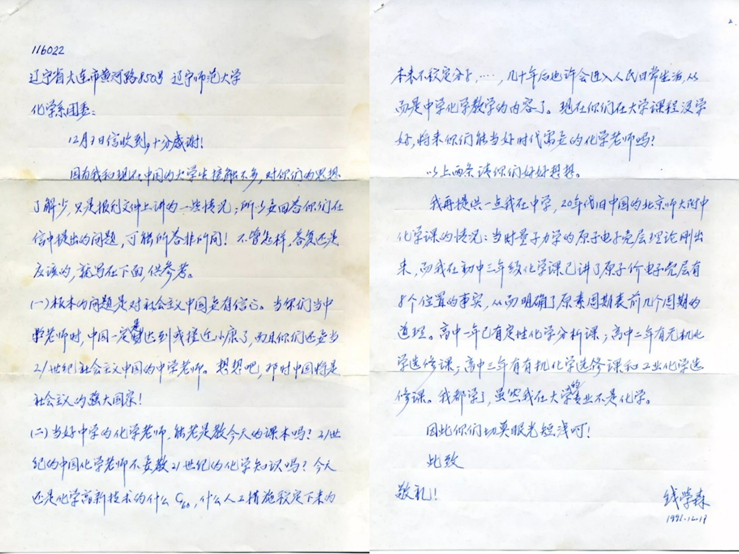 199112月,正值我国航天事业奠基人、杰出科学家钱学森先生八十寿辰,时任金牌影院 化学系团委书记靳国卫提议,化学系学生会同学执笔,就如何树立正确的理想信念、毕业后如何更好地从事中学教师工作以及如何搞好今天的学习等问题向钱老致信。10天后,钱老亲笔为化学系青年师生写了复信。复信中,钱老明确指出,要对社会主义中国有信心,为当好21世纪的中国化学老师做准备,切莫眼光短浅。