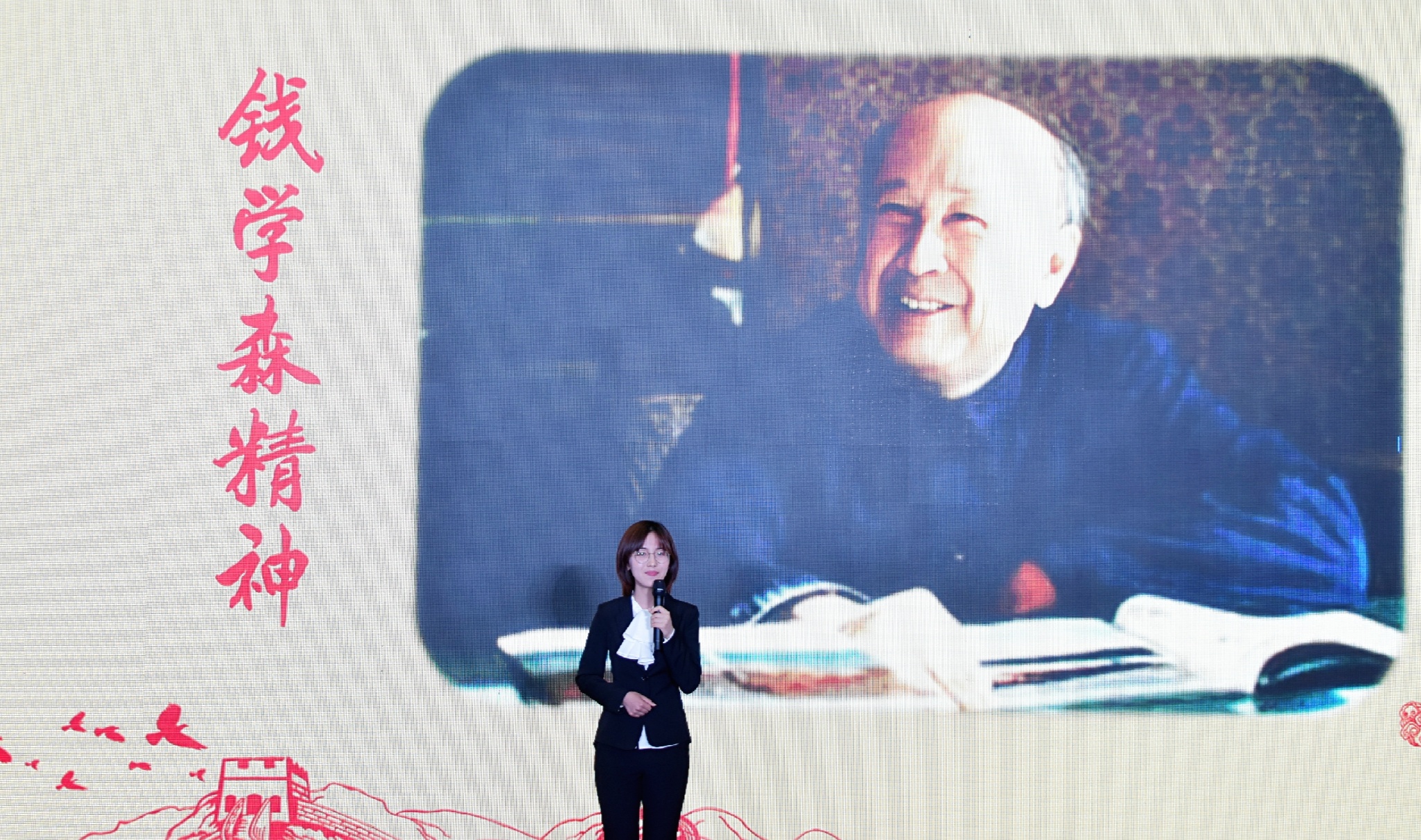 2017级1班赵思佳同学带来题为《让钱学森精神走进新时代青年》的演讲。她从一条“五四晚会”的微博热搜谈到习近平总书记在纪念五四运动100周年大会上的讲话。她号召青年学子继承钱学森精神,心怀赤子之心,用求实和创新做武器,为祖国建设奉献智慧和力量。