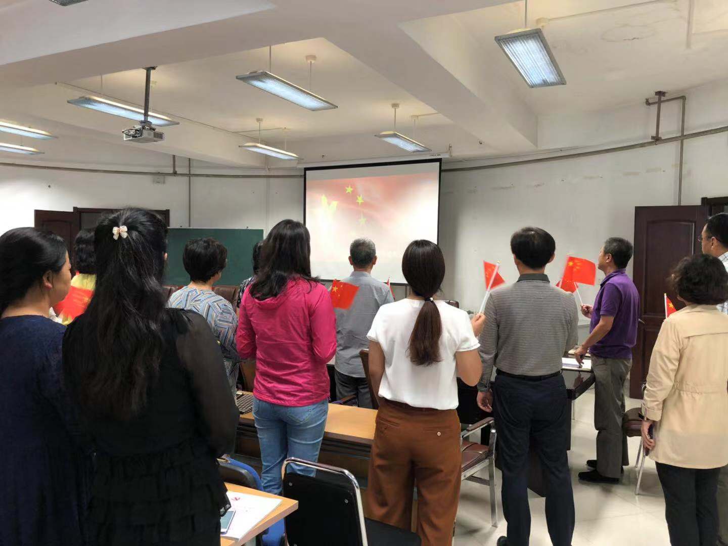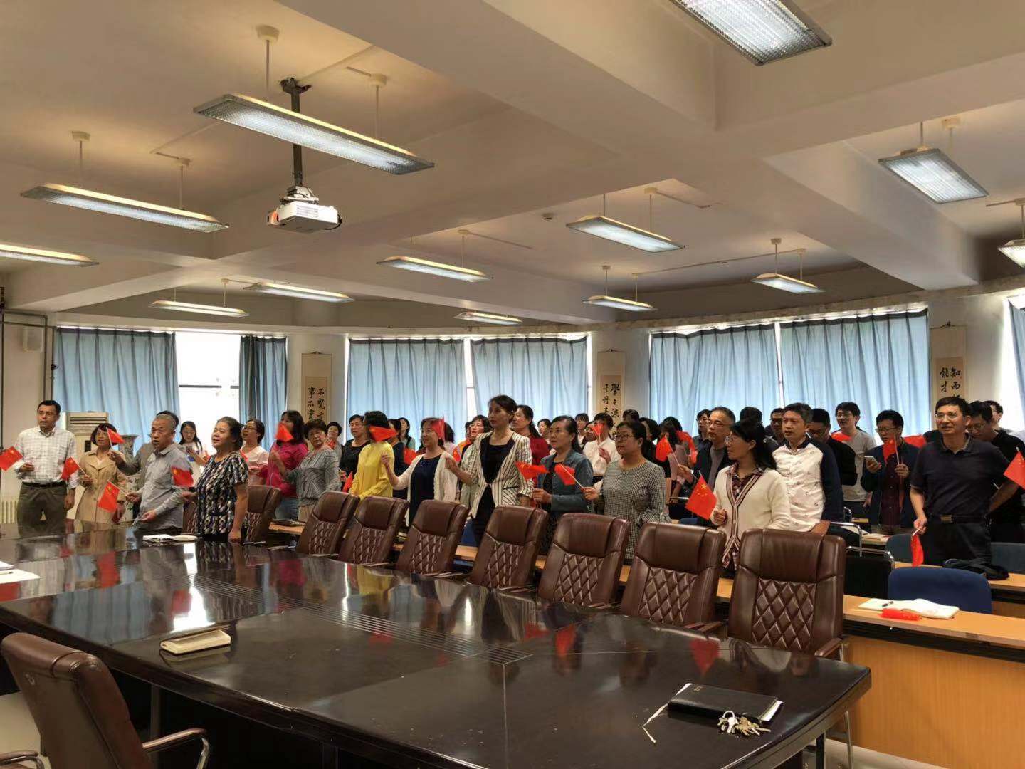为落实“不忘初心·牢记使命”主题教育工作,庆祝新中国国70周年华诞,9月20日下午14:00,在理化楼C区401会议室,金牌影院 全院教师手持国旗齐唱《歌唱祖国》。