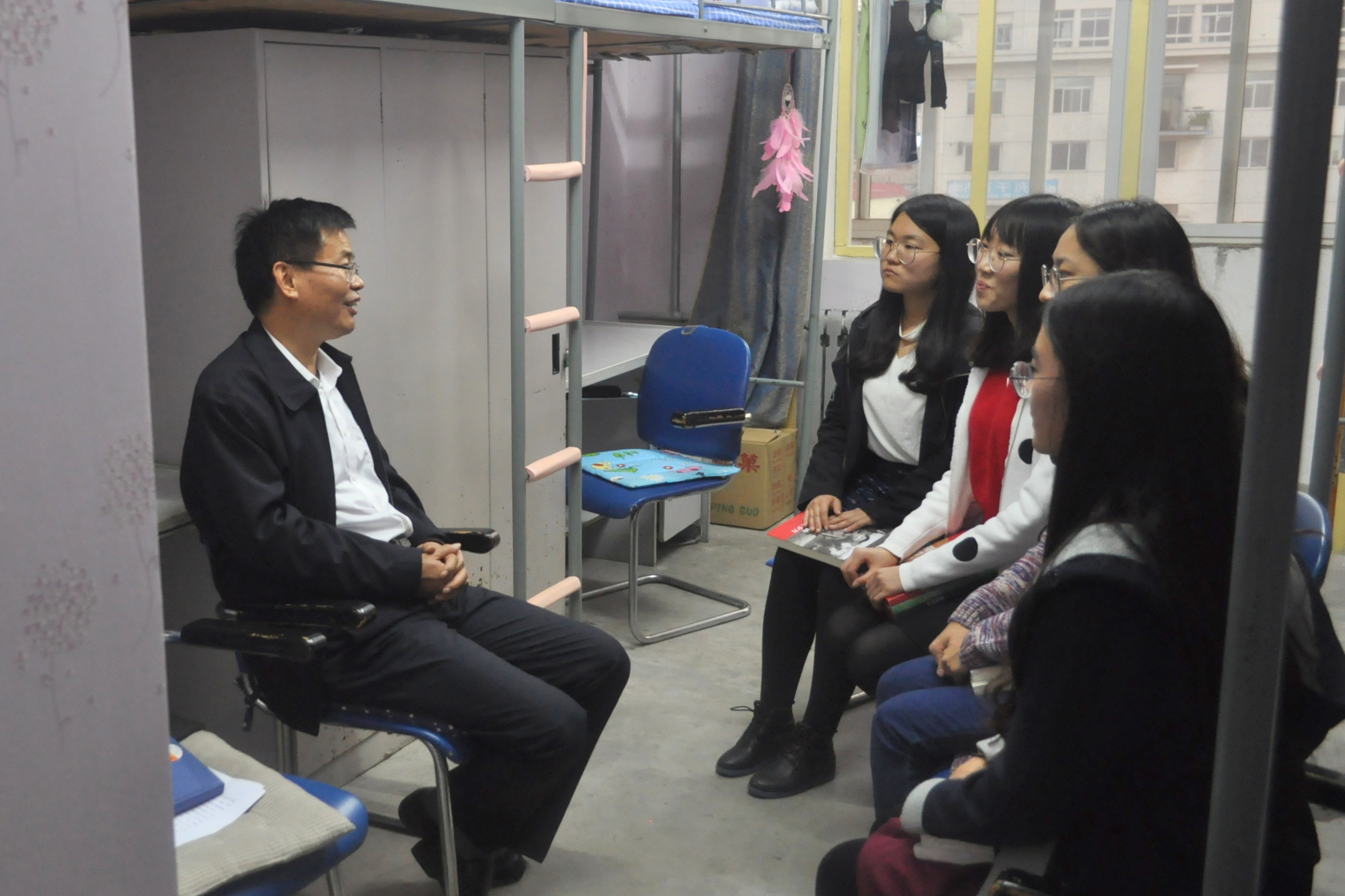 10月18日下午,岳崇兴副校长走进后大学生公寓城四公寓416学生寝室,与金牌影院