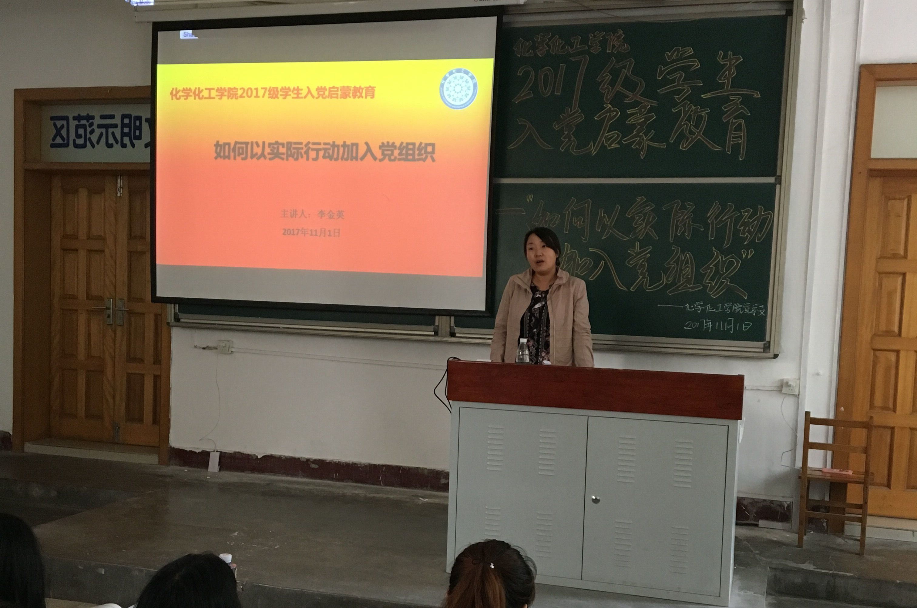 于管理楼102举办2017级学生入党启蒙教育第二讲,由学院党总支副书记李金英老师做题为“如何以实际行动加入党组织”的专题报告。