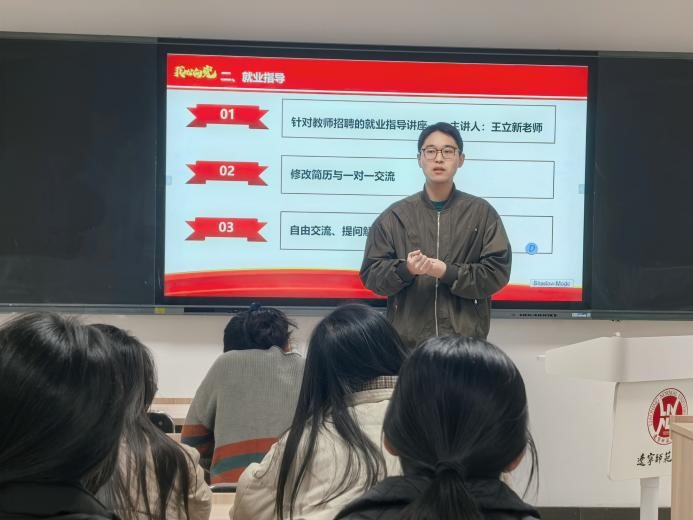 值得一提的是,由王立新老师指导的研究生滕飞结合此类方法,已成功签约大连市一一七中学。他在现场围绕招聘准备与面试注意事项,分享了从实战中总结的具体经验与心得,为在座同学提供了可借鉴的求职路径与方法参考。通过理论引导与案例分享相结合,与会同学对就业过程有了更清晰的认知,普遍表示深受启发。