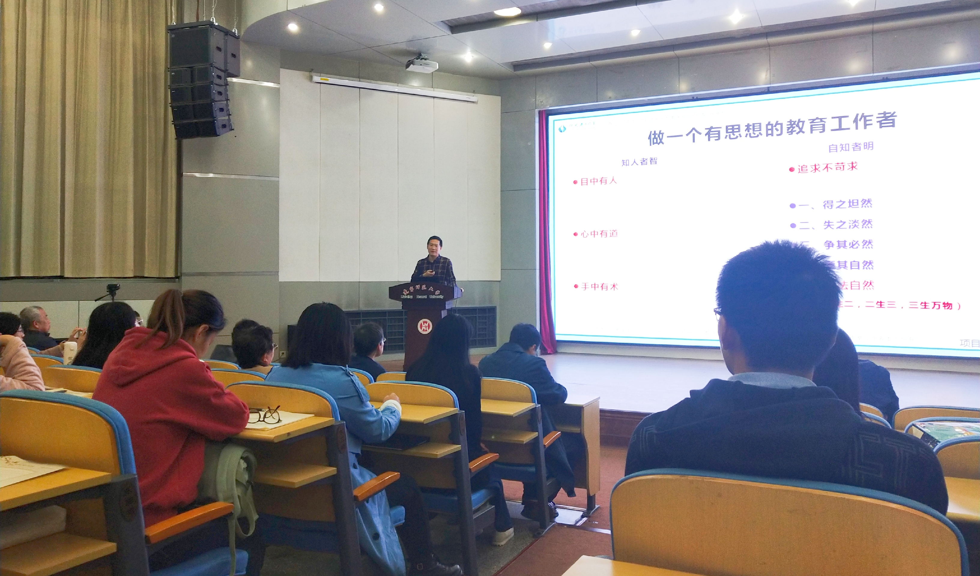 紧接着,何长涛老师正式开始报告。何老师首先真诚地感谢学院的精心培养,回忆19年的从教事业,并表示人的成长不是个人问题,是大家包容、共享、融通的过程。随后,何老师将报告分成三个部分与大家分享。