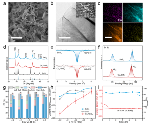 图2.Cu1/SnS2催化剂的结构表征与电化学CO2还原性能。(a),Cu1/SnS2的SEM图像,比例尺:1µm;(b),Cu1/SnS2的TEM图像,比例尺:100nm(插图为HAADF-STEM图像);(c),Cu1/SnS2的EDS元素分布图,比例尺:200nm;(d),SnS2、Cu1/SnS2和CuS的XRD衍射图谱;(e),SnS2和Cu1/SnS2的室温119Sn穆斯堡尔谱;(f),SnS2和Cu1/SnS2的Sn 3d XPS谱图;(g),不同产物在2 mol/L KOH电解液中的法拉第效率及(h),SnS2、Cu1/SnS2和CuS在不同阴极电位下的甲酸盐分电流密度;(i),Cu1/SnS2在2 mol/L KOH电解液中于-1.0 V(vs RHE)电位下的稳定性测试结果。