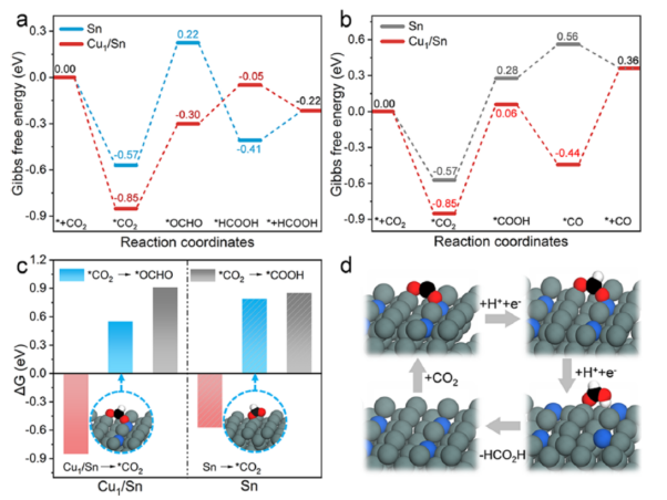 图3.理论计算结果。(a),CO2还原为HCOOH和(b),CO的自由能计算图。(c),Cu1/Sn位点和Sn位点上OCHO与COOH形成的ΔG计算值。(d),Cu1/Sn催化剂中CO2RR转化为HCOOH的反应路径示意图(Cu:蓝色;Sn:灰色;O:红色;C:黑色;H:白色)。